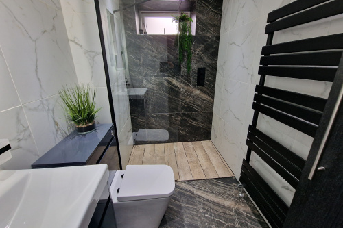 We worked to bring our customer's dream bathroom into reality. We created a custom-made tiled shower base and carefully selected complementary tile colours, matched with elegant black accessories, taps and radiator to complete the design for an eye-catching final look!